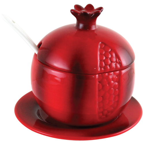 Ceramic Honey Dish Pomegranate, Red with White Spoon